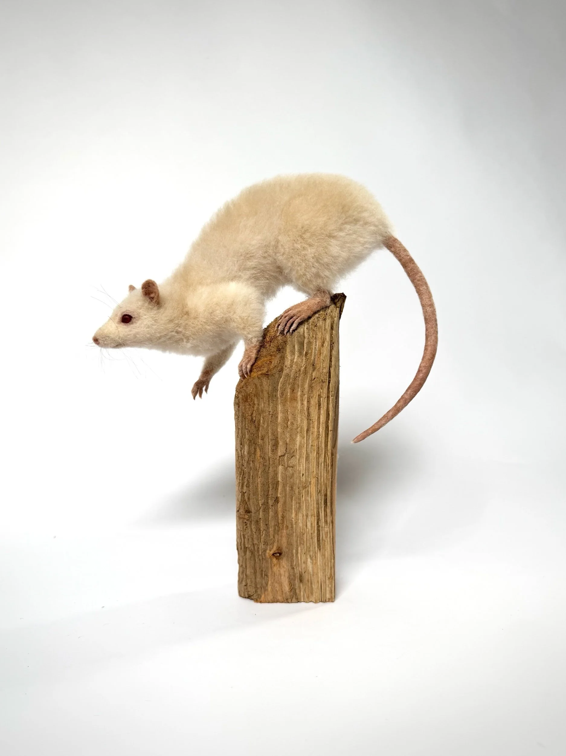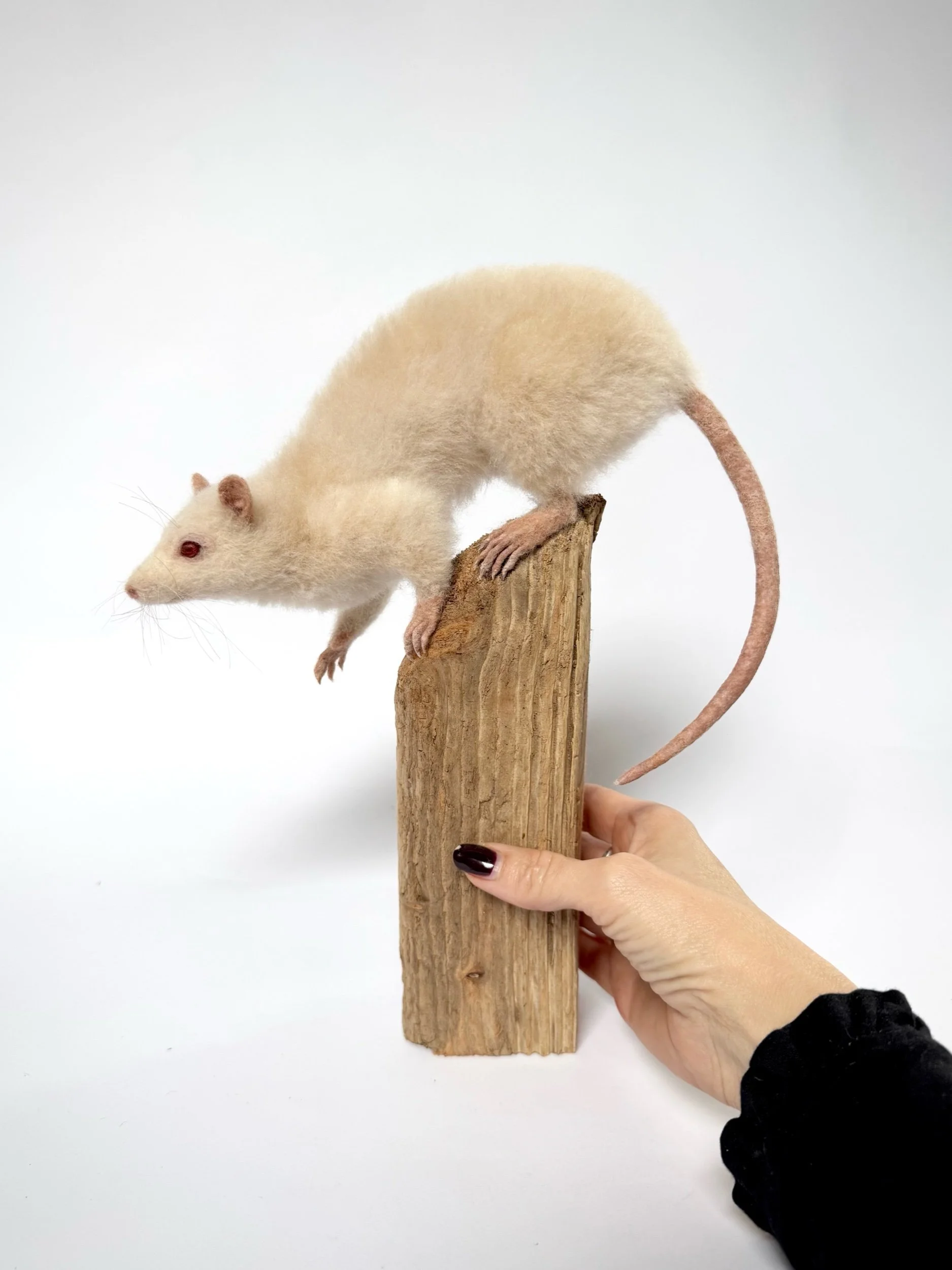 Needle felted around a wire armature using natural and dyed sheep’s wool. The rat is attached to its base.