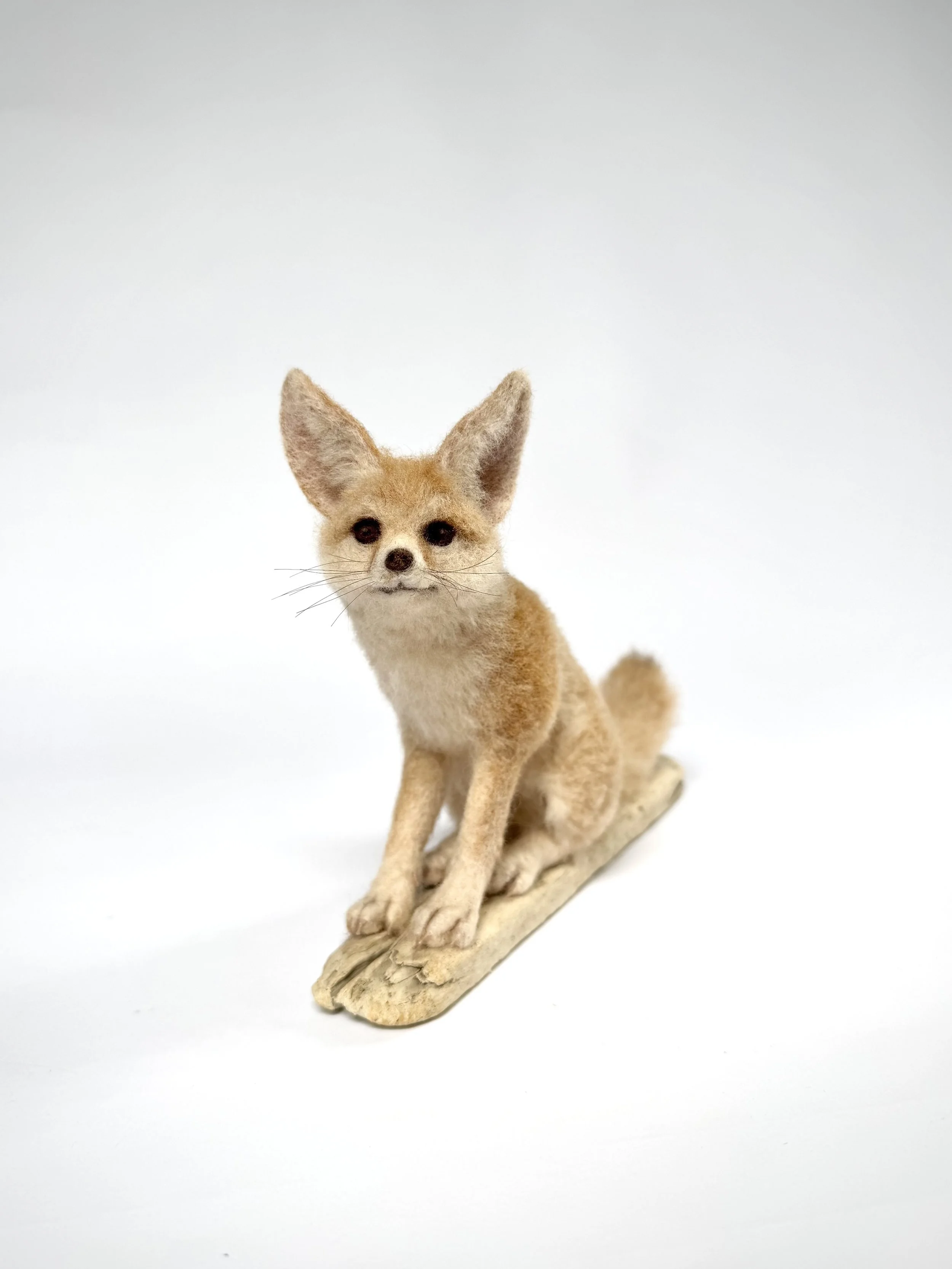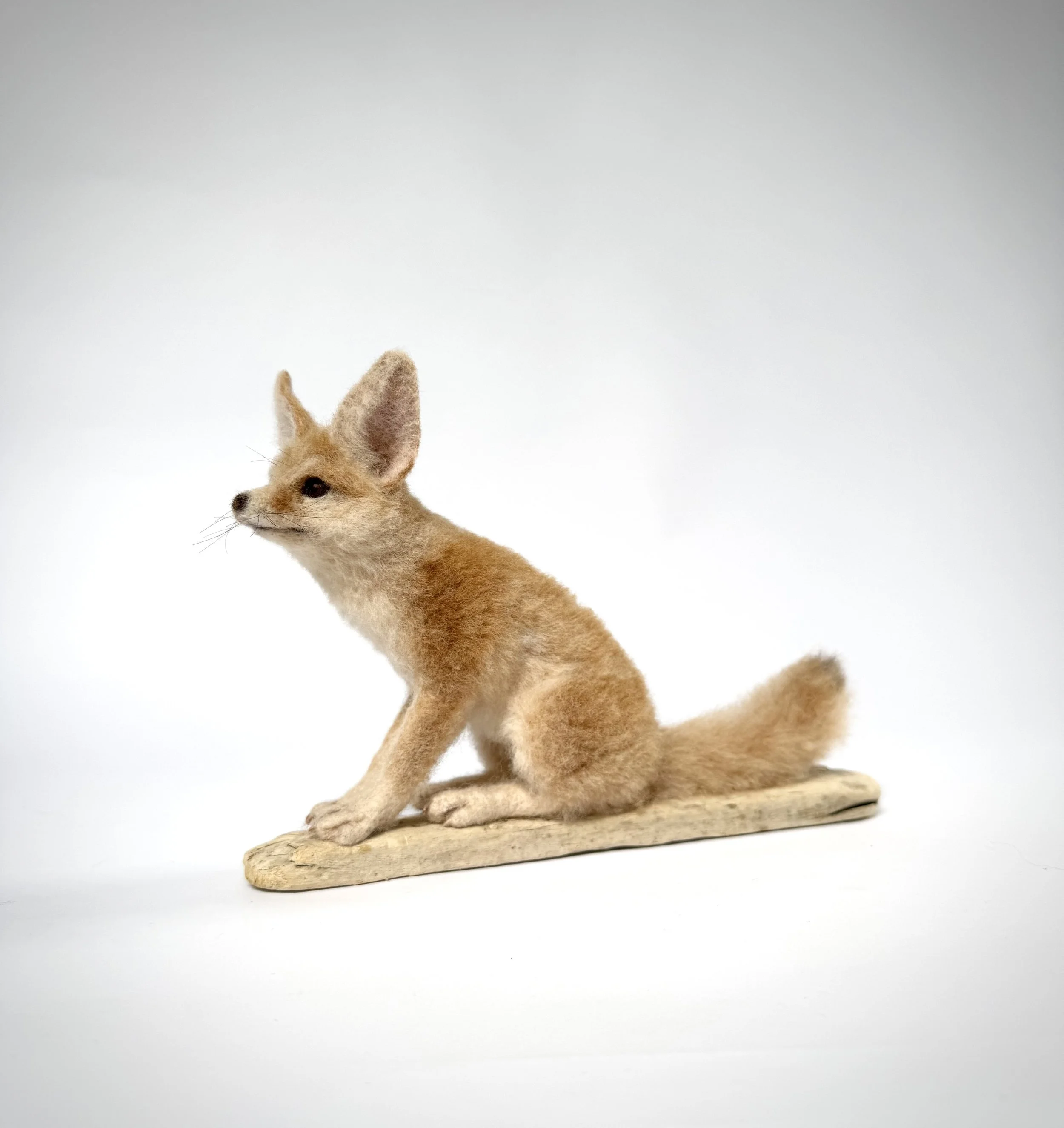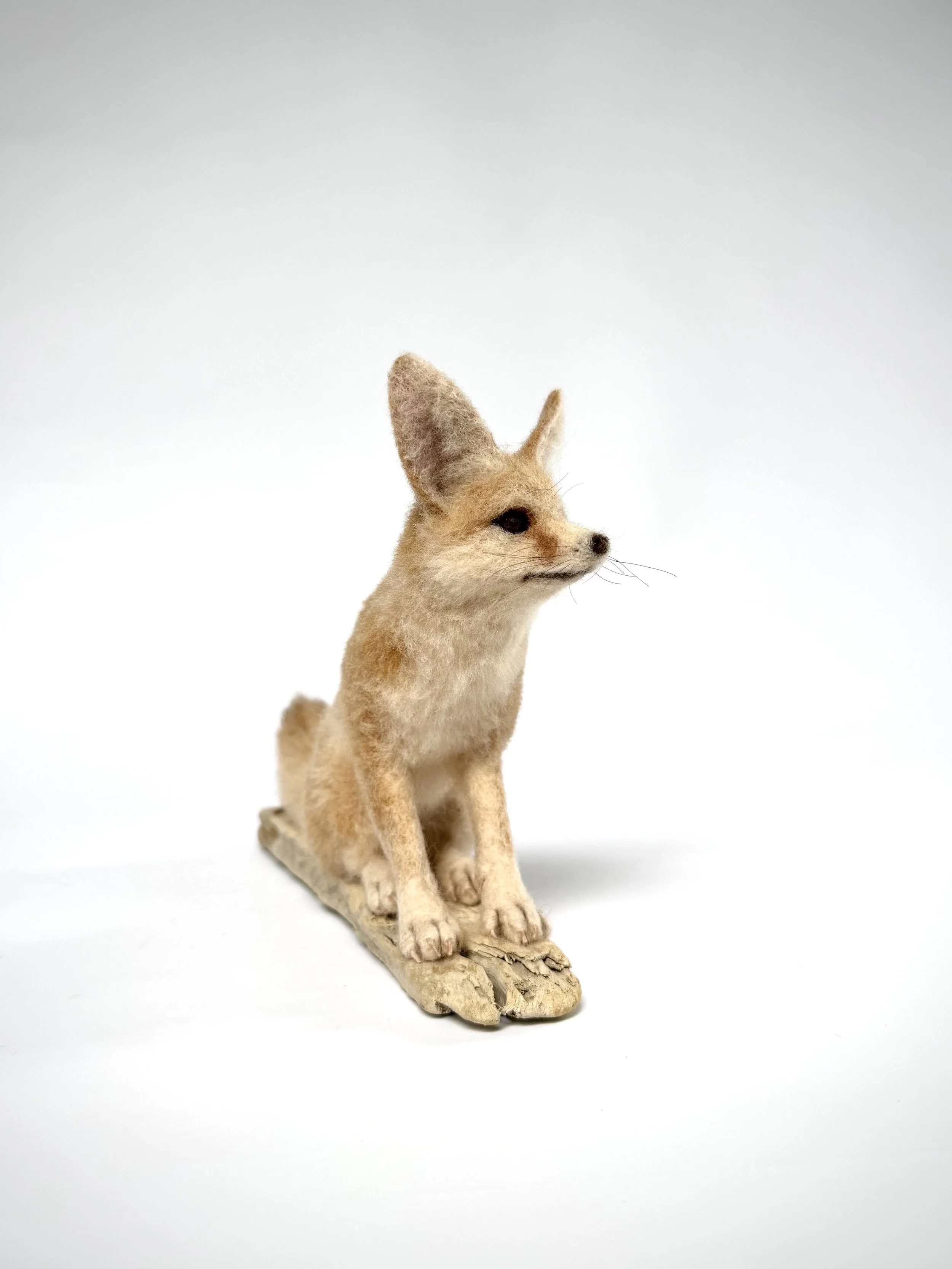 Needle felted around a wire armature using natural and dyed sheep’s wool. The fox is attached to its base.