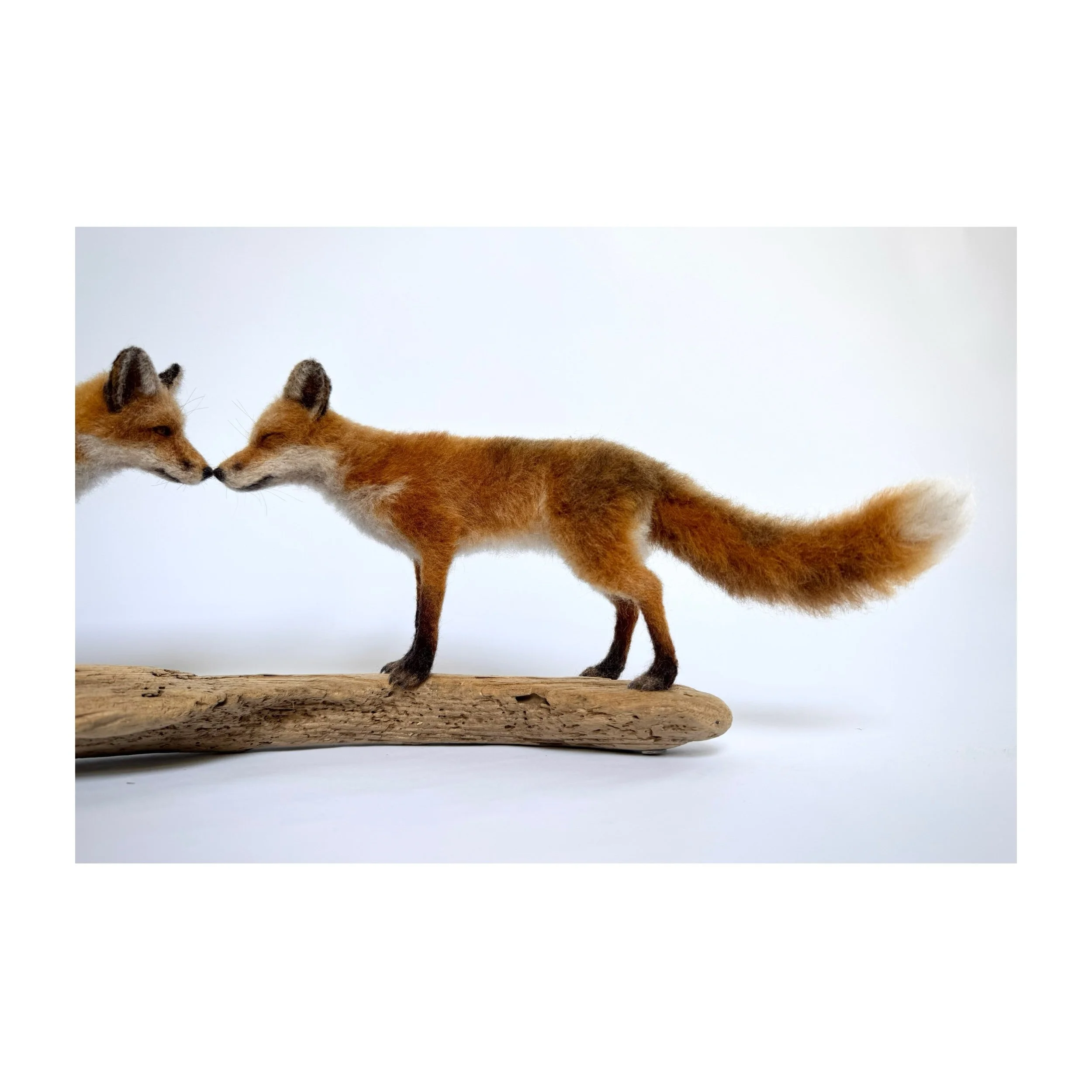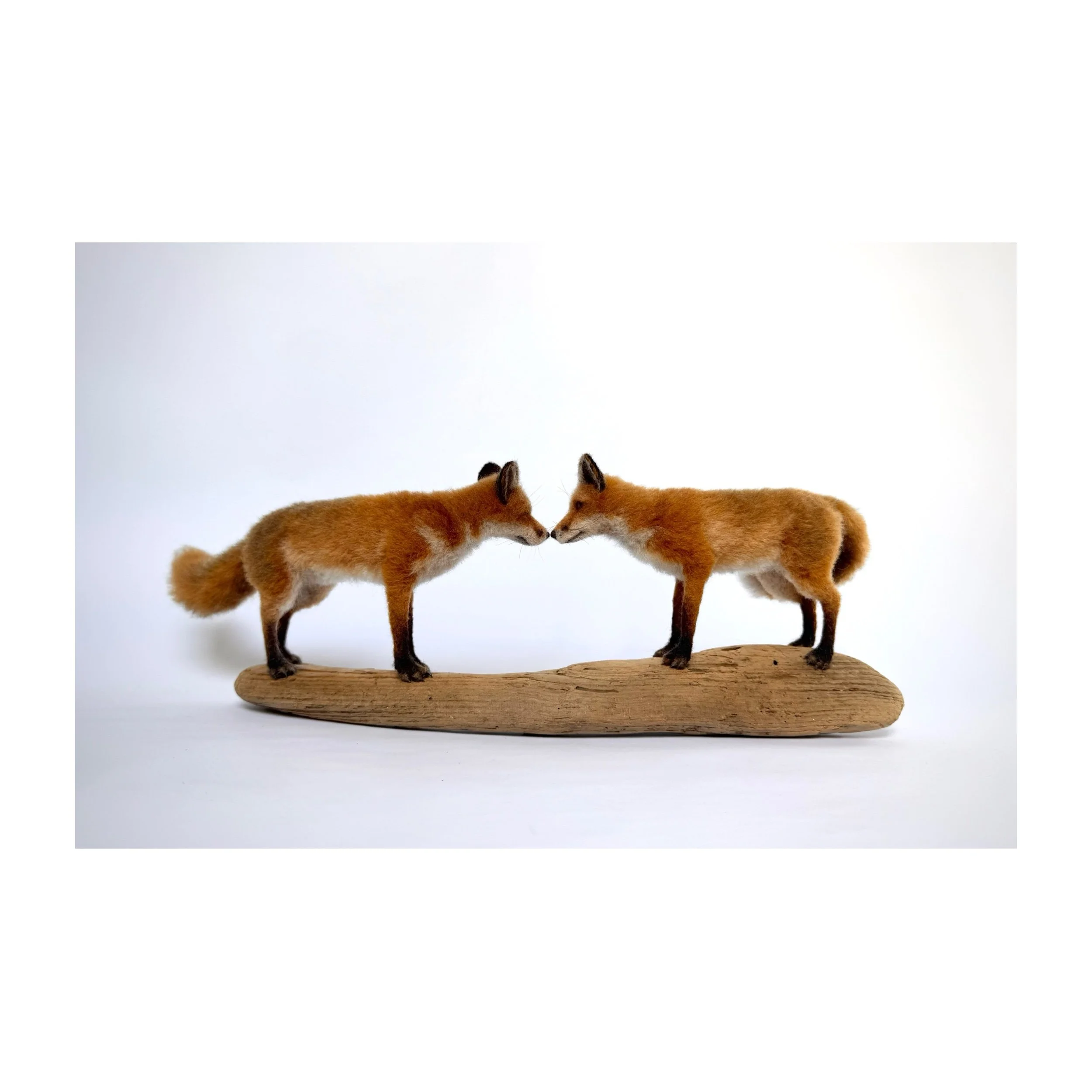 Needle felted around wire armatures using natural and dyed sheep’s wool. The foxes are attached to their driftwood base.
