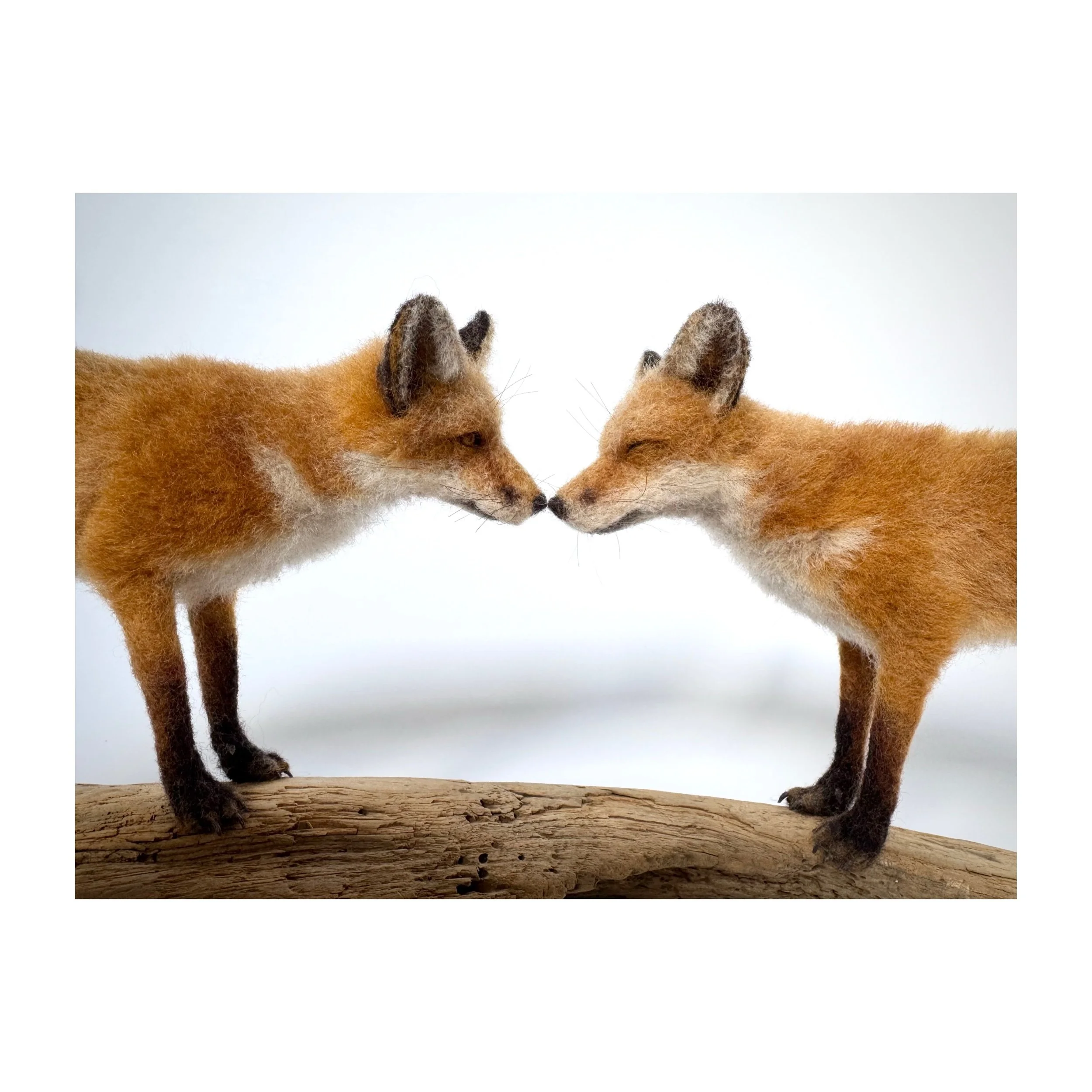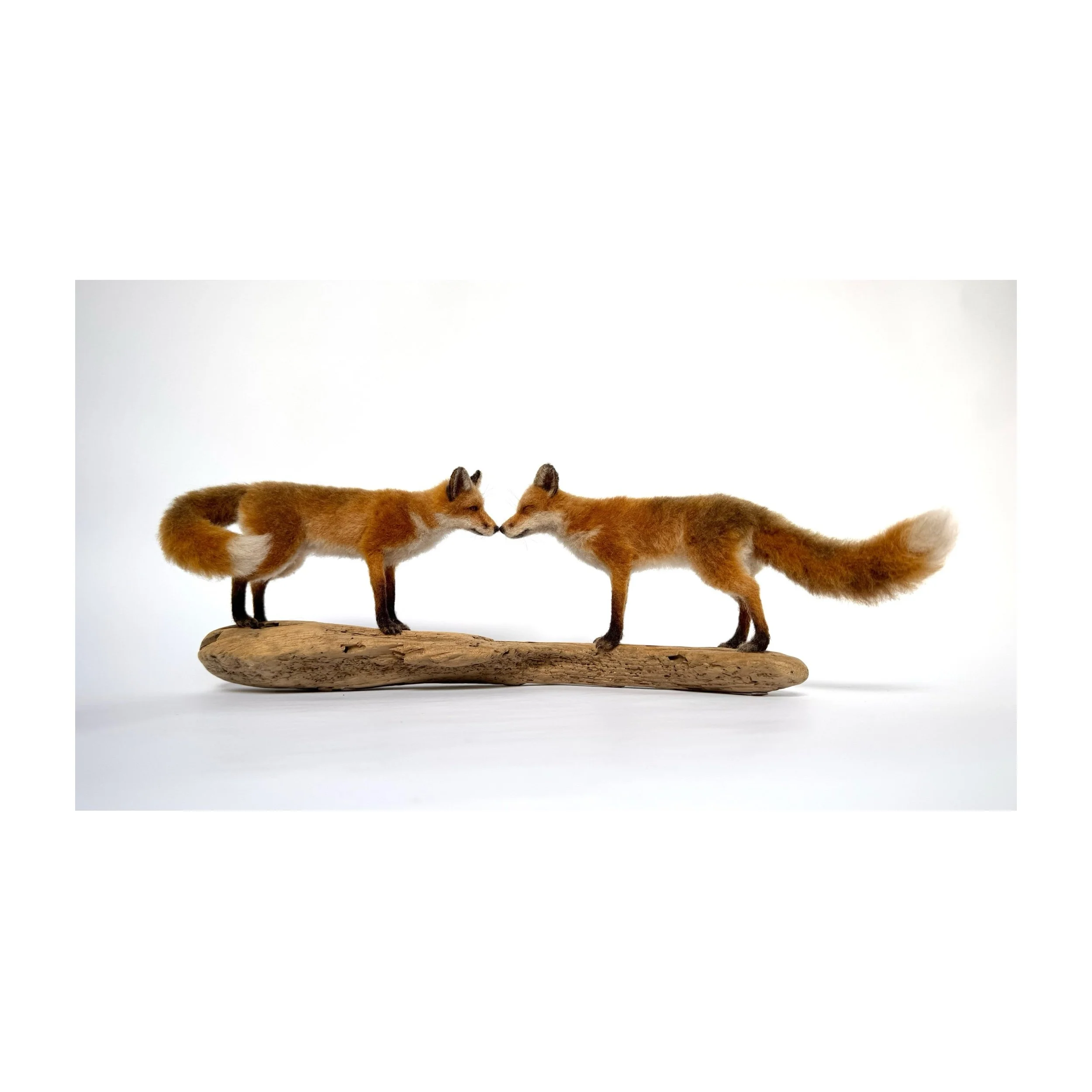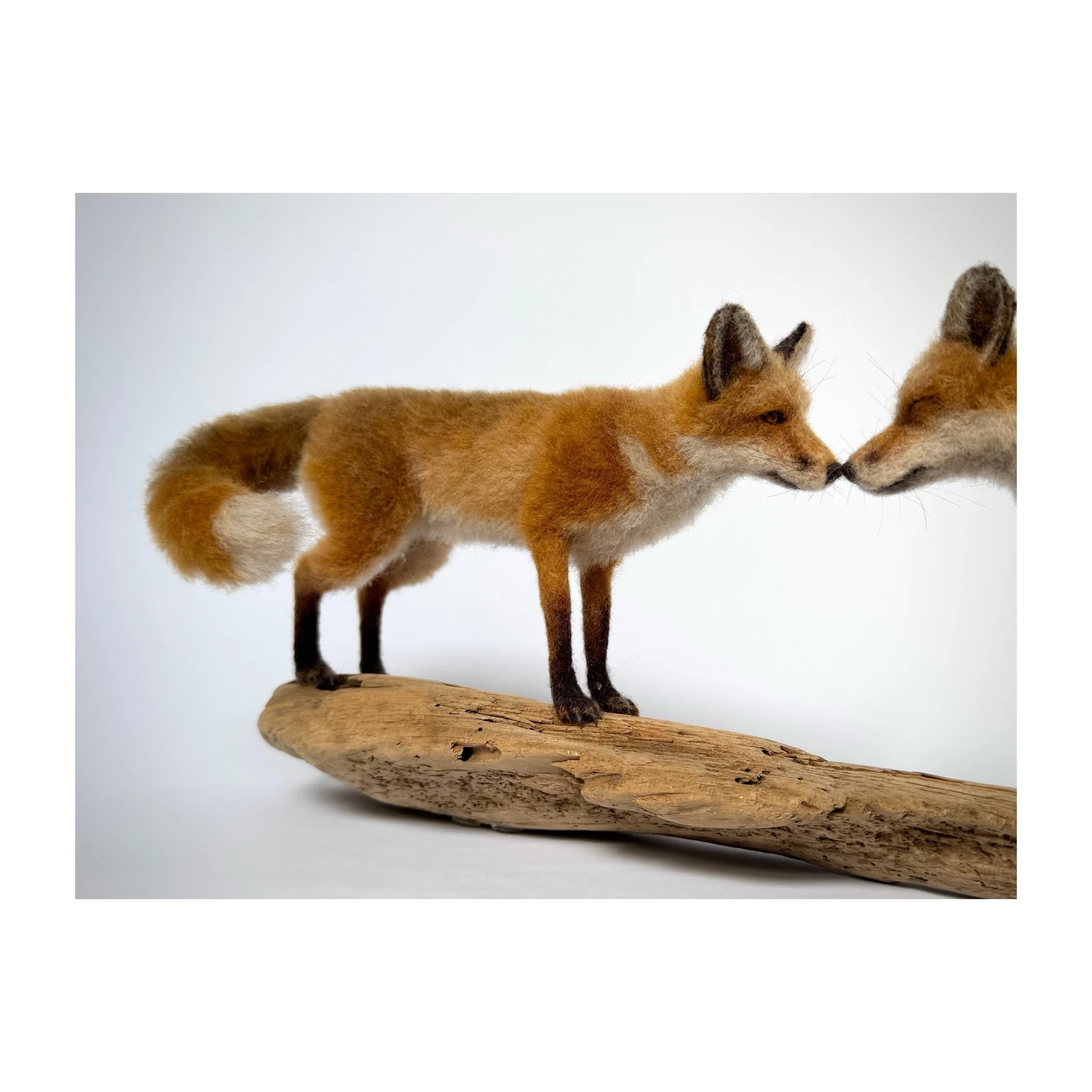 Needle felted foxes on a driftwood base